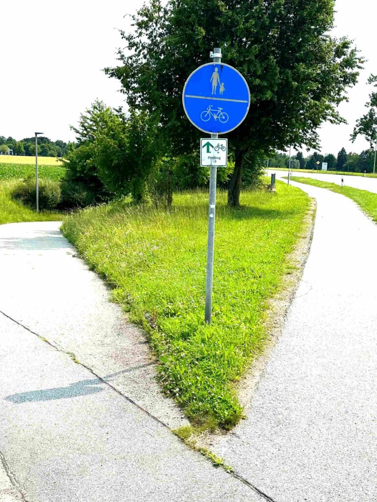 Zwei Fahrradwege, ein Schild und doch keine Orientierungshilfe. Der Richtungspfeil auf dem Schild zeigt exakt in die Mitte zwischen beiden Wegen und lässt den Radler ratlos zurück. Statt Orientierung entsteht ein Moment des Zögerns: Geht’s links oder rechts weiter?
