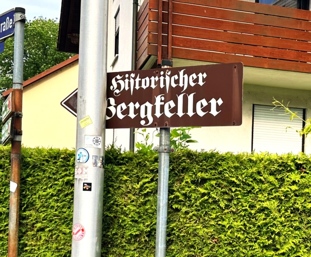 Drei Faktoren machen dieses Schild eher zu einer Denksportaufgabe als einem Hinweisgeber: Die Pfeilspitze, die von der Laterne verschluckt wird, muss man erst suchen. Die verschnörkelte Frakturschrift kann nicht jeder entziffern. Das bräunliche Farbschema fällt vor grüner Hecke und Holzbalkon wenig auf.